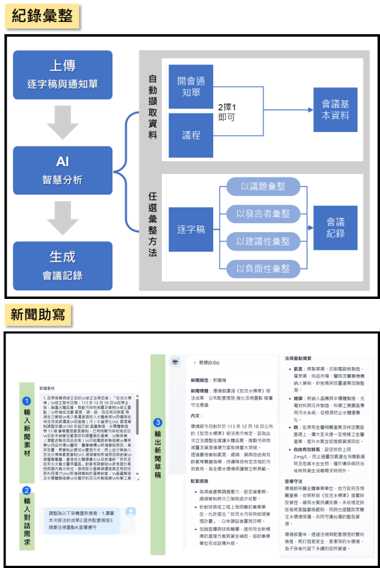 - 新聞助寫:協助使用者撰寫自定義段落之環境部新聞稿。