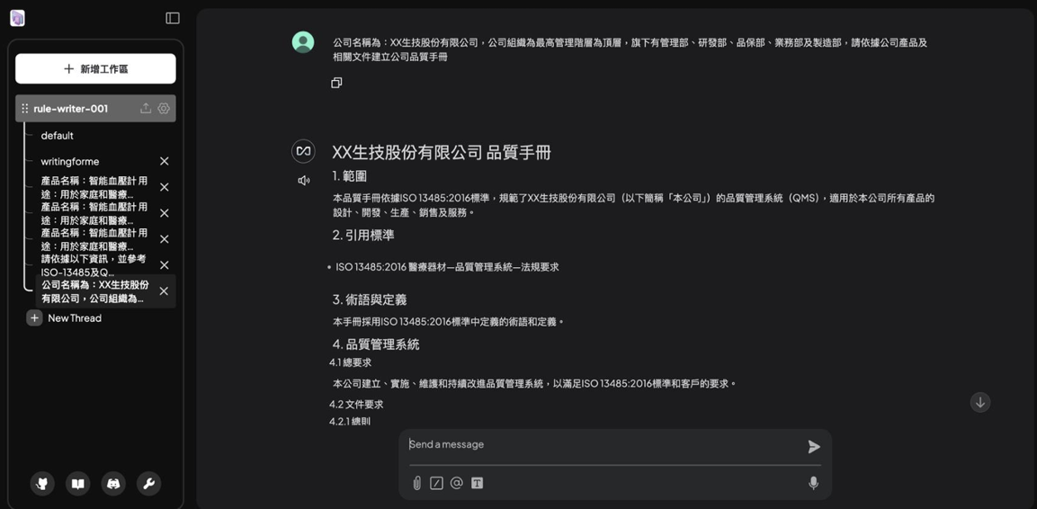 目前可參照範本並依據提供的相關知識建立品質手冊樣板,若提供公司資訊,可將公司資訊摘要帶入。可透過提供簡單的公司資訊,快速建立出公司品質手冊樣板。