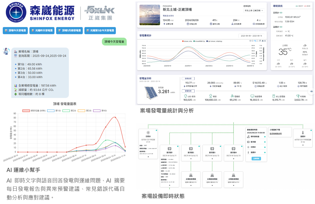 本系統整合太陽能發電即時資料,透過 AI 自然語言問答服務。運維單位可透過語音或文字輸入查詢發電量、設備錯誤說明、發電減碳量等資訊,並即時獲得回應。